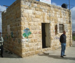 As we learned in early March 2011, only older adults and some families who have living space remain in Nabi Samuel. The village is located in Area C in the West Bank, according to the Oslo Agreement of the 1990s (click here). This means that the Israeli government has planning, building, and military control and has not permitted any new construction. The community does not have any health clinic or facilities. The school is only a few square metres. The village council has applied to build an additional schoolroom but has been denied that permit. A small, lean-to like bathroom was built on an outer wall of the school; it was demolished by the Israeli authorities. Currently, a re-constructed bathroom exists but remains unfinished – a result of living in the limbo of Area C. A skeleton of a frame for a shelter, for the children to use when playing outside at recess, waits for an Israeli permit. Desks and chairs for more than 10 pupils is optimistic in the existing school building. Other Nabi Samuel children travel to different schools with their parents on their way to work into the West Bank.